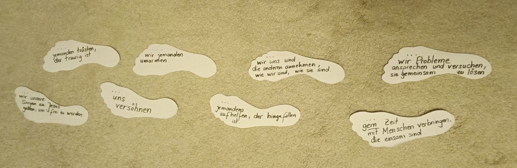 Im Weihnachtsgottesdienst hatten die Kinder der St. Marien-Schule überlegt, welche Handlungsweisen uns Menschen näher zur Krippe, näher zum Jesuskind bringen. Diese hatten sie auf Fußspuren geschrieben und einen Weg zu der noch leeren Futterkrippe in der Nikolai-Kirche gelegt.