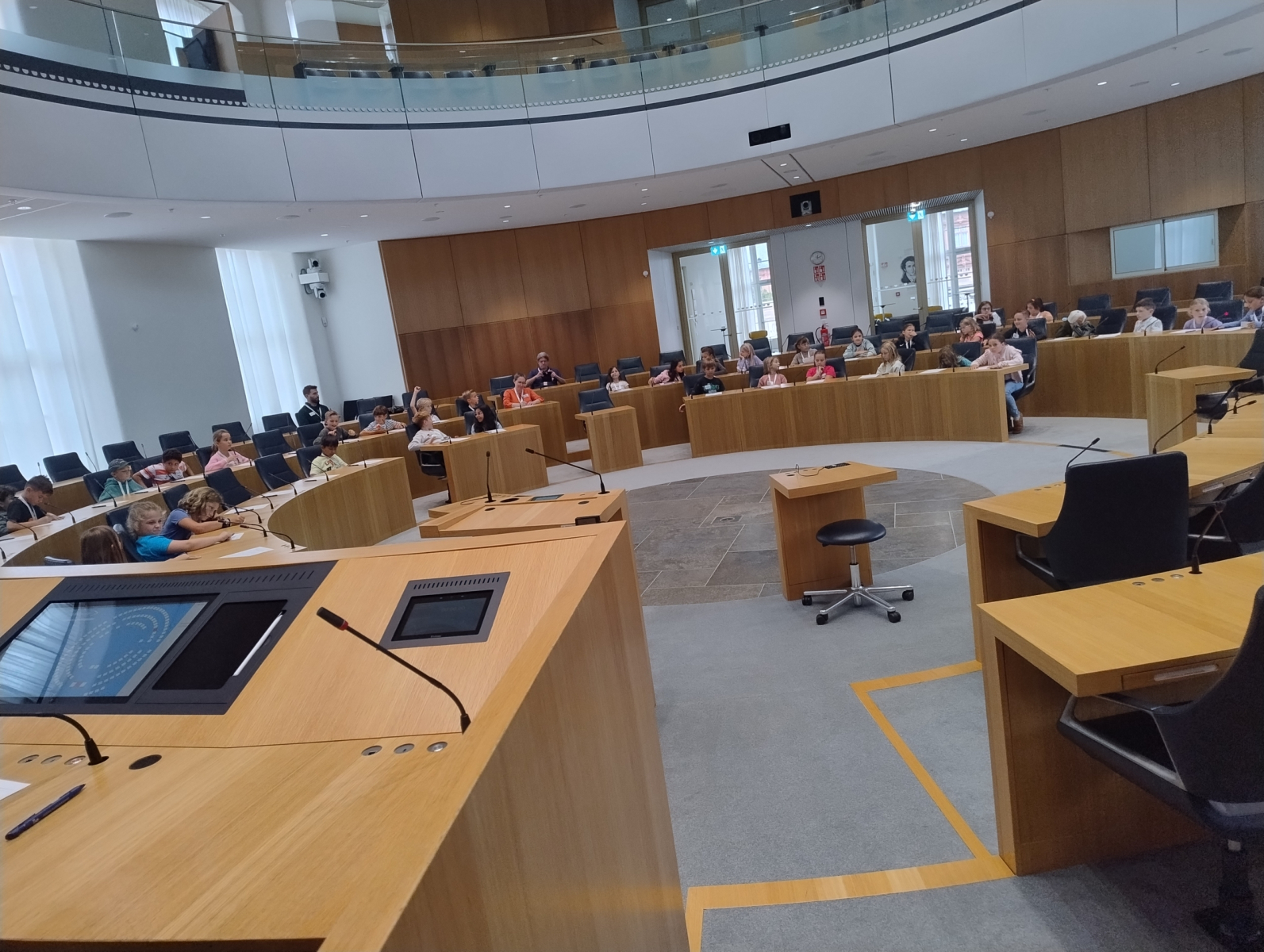 Am 8. September startete die Schule für die 45 Grundschüler zur gewohnten Zeit. Allerdings war die Schule nur Treffpunkt für den Gang zum Bahnhof und die Fahrt nach Mainz in den Landtag. Dort angekommen, wurden erst einmal Erinnerungsfotos geschossen, bevor sich die Türen zum außerschulischen Lernort öffneten.