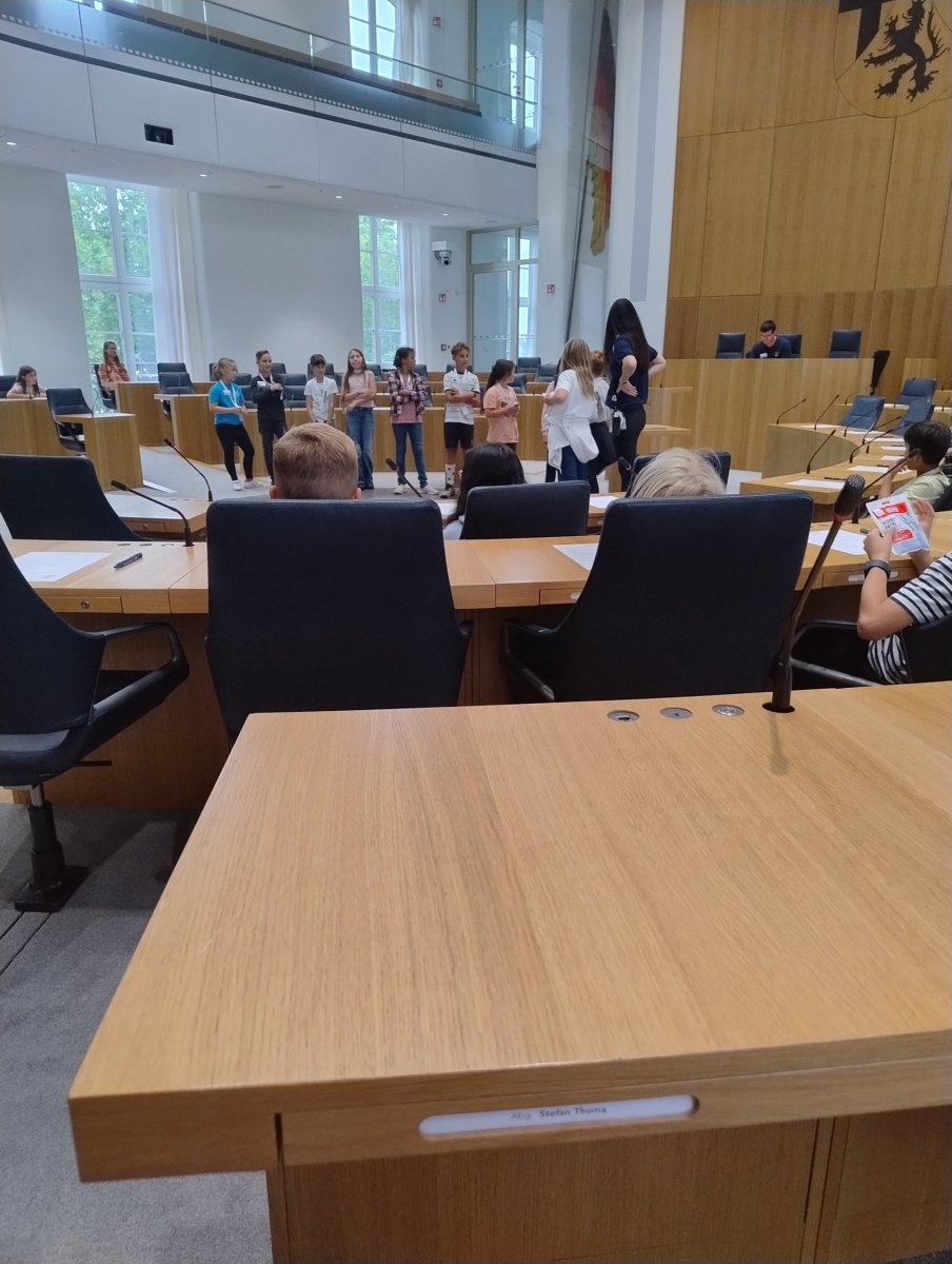 Am 8. September startete die Schule für die 45 Grundschüler zur gewohnten Zeit. Allerdings war die Schule nur Treffpunkt für den Gang zum Bahnhof und die Fahrt nach Mainz in den Landtag. Dort angekommen, wurden erst einmal Erinnerungsfotos geschossen, bevor sich die Türen zum außerschulischen Lernort öffneten.
