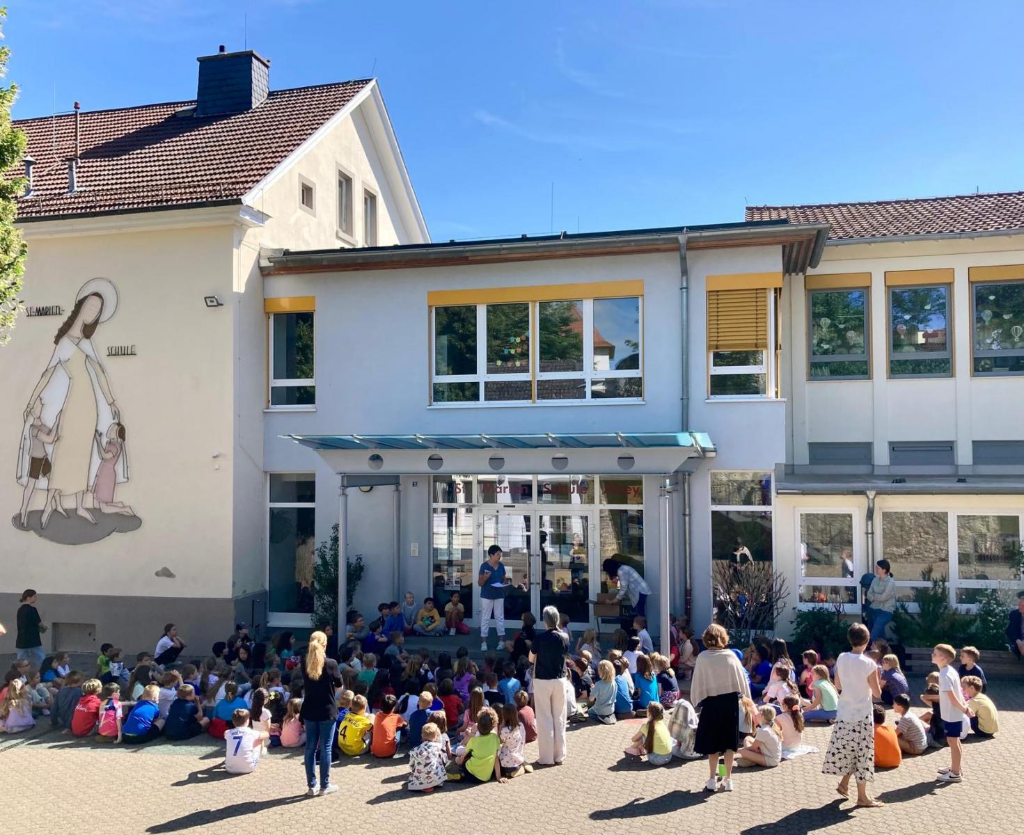 Umgeben von Teilen der Stadtmauer liegt unsere staatlich anerkannte private Schule zentral im Alzeyer Stadtkern, nicht weit von der katholischen Kirche St. Josef und der evangelischen Nikolaikirche. Die Schulgesellschaft des Bistums Mainz ist unser Träger und wir sprechen Eltern mit Kindern des Einzugsgebietes der Stadt Alzey und der umliegenden Ortschaften an. Derzeit besuchen 181 Kinder unsere zweizügige Schule. Wir sind eine volle Halbtagsschule mit einem Betreuungsangebot bis 16.00 Uhr, flexiblen Abholzeiten und Mittagessen.