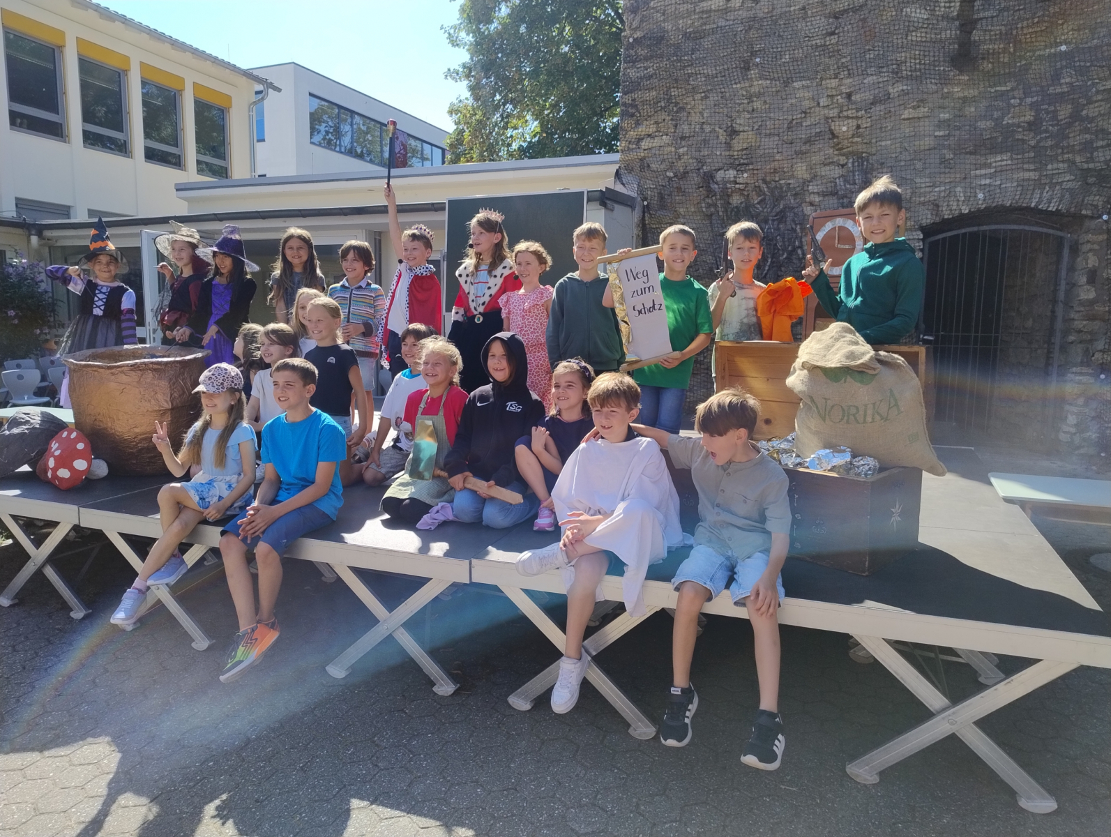 Am 19.08.25 wurden unsere neuen Erstklässler mit einem feierlichen Programm auf unserem Schulhof begrüßt und willkommen geheißen. Die Klasse 3b hatte dafür extra ein kleines Theaterstück einstudiert: In der Geschichte stellt ein Königspaar fest, wie wichtig es ist, lesen zu können, um wichtige Entscheidungen treffen zu können und nicht das falsche Essen zu bestellen.