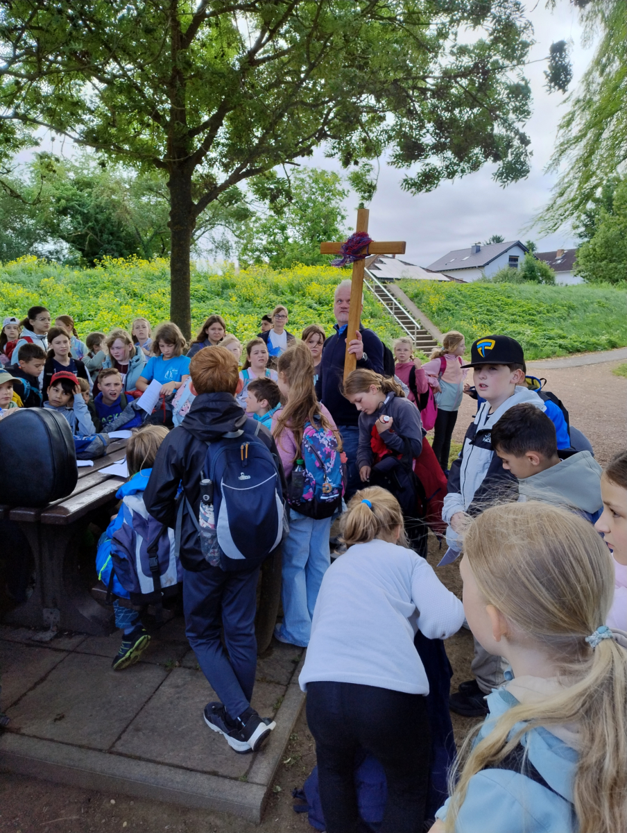 Am 06.06.25 fand unser erstes Projekt in Kooperation mit der Pfarrei St. Joseph statt: ein gemeinsamer Pilgertag. Nach einem Gottesdienst in der katholischen Kirche um 8.15 Uhr mit dem Impuls „Sorgt euch nicht!“ starteten wir unsere Tour mit etwas zeitlicher Verzögerung aufgrund des unbeständigen Wetters. Doch ab dann hatten wir Glück: Das Wetter hielt, immer wieder ließ sich auch die Sonne durch die Wolken blicken. Unterwegs hielt die Gruppe an verschiedenen Stationen, die vom Vorbereitungsteam sorgfältig ausgewählt und auf das Thema „Gottes wunderbare, bunte Schöpfung“ abgestimmt waren. Die Kinder bekamen ein Pilgerbüchlein mit Aufgaben, die sie erfüllen sollten. Es wurden gemeinsam Lieder mit Gitarrenbegleitung gesungen und Dankes-Sätze notiert. Ein besonderer Moment war das Nutria, das sich für eventuelle Essensreste in unseren Rucksäcken interessierte und sehr neugierig und dazu wenig menschenscheu war.