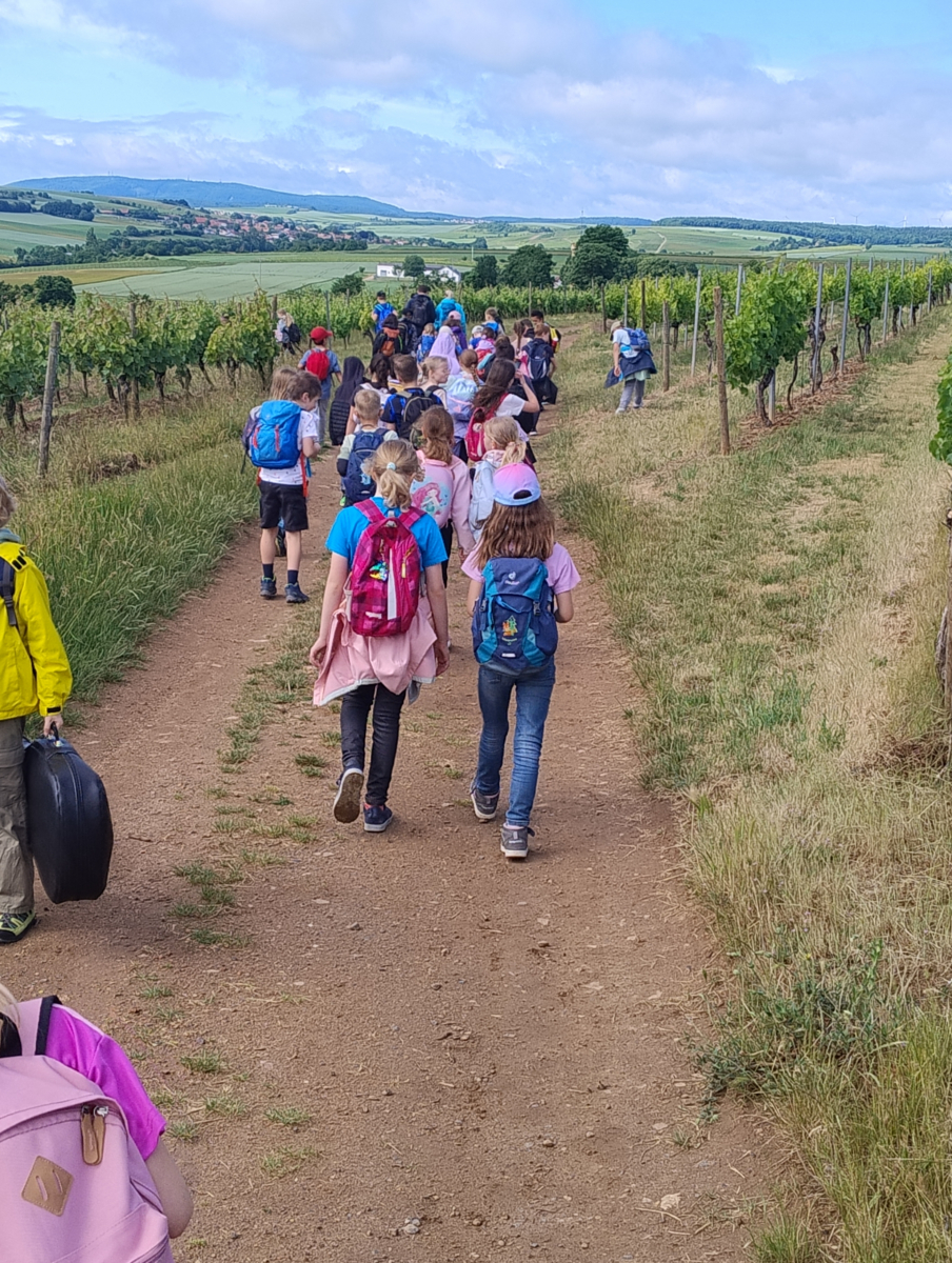 Ein anstrengender Aufstieg danach wurde mit einem herrlichen Ausblick belohnt. Unterwegs ergab sich das ein oder andere nette Gespräch in der heiteren Gemeinschaft. Gegen 11.30 Uhr erreichten wir unser Ziel St. Gallus in Weinheim. Wir wurden mit dem Geläut der Marienglocke eigens begrüßt. In der dortigen Pfarrkirche inmitten eines sehr gepflegten Gartens hielten wir den geistlichen Abschluss unseres Pilgertages. Danach schloss sich im Pfarrgarten die unbedingt notwendige und bestens organisierte Stärkung an: Es gab Würstchen im Brötchen und Getränke für alle. Vielen herzlichen Dank an die Pfarreimitglieder, die hier mitgeholfen und somit zum Gelingen dieses Tages beigetragen haben!