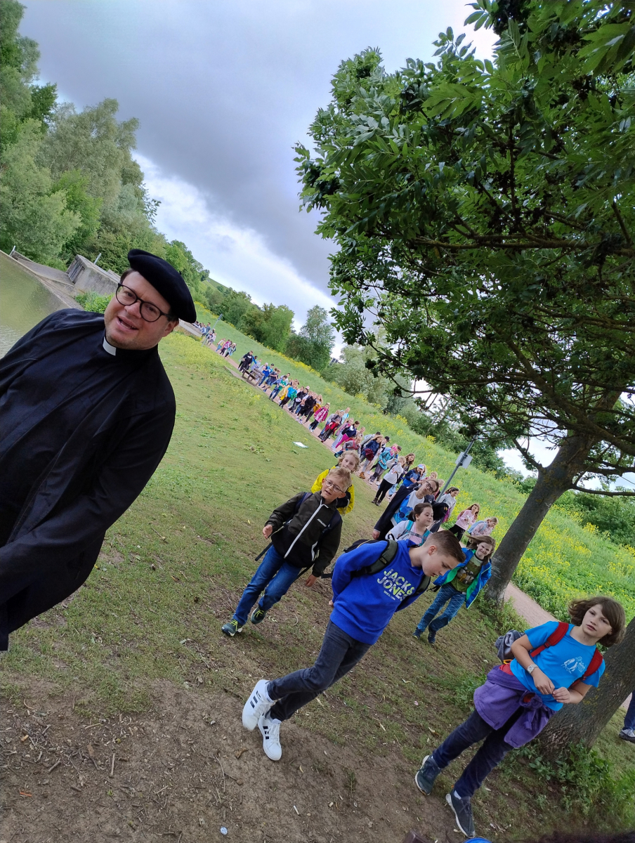 Am 06.06.25 fand unser erstes Projekt in Kooperation mit der Pfarrei St. Joseph statt: ein gemeinsamer Pilgertag. Nach einem Gottesdienst in der katholischen Kirche um 8.15 Uhr mit dem Impuls „Sorgt euch nicht!“ starteten wir unsere Tour mit etwas zeitlicher Verzögerung aufgrund des unbeständigen Wetters. Doch ab dann hatten wir Glück: Das Wetter hielt, immer wieder ließ sich auch die Sonne durch die Wolken blicken. Unterwegs hielt die Gruppe an verschiedenen Stationen, die vom Vorbereitungsteam sorgfältig ausgewählt und auf das Thema „Gottes wunderbare, bunte Schöpfung“ abgestimmt waren. Die Kinder bekamen ein Pilgerbüchlein mit Aufgaben, die sie erfüllen sollten. Es wurden gemeinsam Lieder mit Gitarrenbegleitung gesungen und Dankes-Sätze notiert. Ein besonderer Moment war das Nutria, das sich für eventuelle Essensreste in unseren Rucksäcken interessierte und sehr neugierig und dazu wenig menschenscheu war.