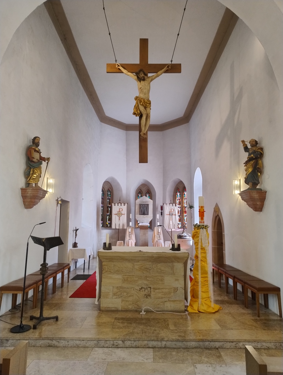 Ein anstrengender Aufstieg danach wurde mit einem herrlichen Ausblick belohnt. Unterwegs ergab sich das ein oder andere nette Gespräch in der heiteren Gemeinschaft. Gegen 11.30 Uhr erreichten wir unser Ziel St. Gallus in Weinheim. Wir wurden mit dem Geläut der Marienglocke eigens begrüßt. In der dortigen Pfarrkirche inmitten eines sehr gepflegten Gartens hielten wir den geistlichen Abschluss unseres Pilgertages. Danach schloss sich im Pfarrgarten die unbedingt notwendige und bestens organisierte Stärkung an: Es gab Würstchen im Brötchen und Getränke für alle. Vielen herzlichen Dank an die Pfarreimitglieder, die hier mitgeholfen und somit zum Gelingen dieses Tages beigetragen haben!