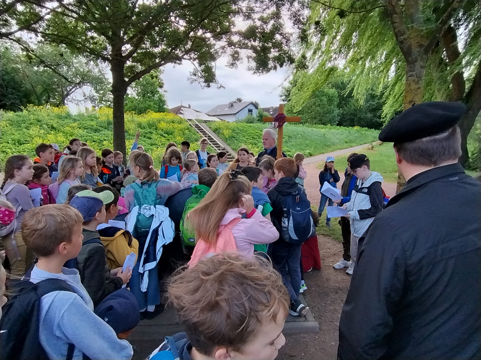 Am 06.06.25 fand unser erstes Projekt in Kooperation mit der Pfarrei St. Joseph statt: ein gemeinsamer Pilgertag. Nach einem Gottesdienst in der katholischen Kirche um 8.15 Uhr mit dem Impuls „Sorgt euch nicht!“ starteten wir unsere Tour mit etwas zeitlicher Verzögerung aufgrund des unbeständigen Wetters. Doch ab dann hatten wir Glück: Das Wetter hielt, immer wieder ließ sich auch die Sonne durch die Wolken blicken. Unterwegs hielt die Gruppe an verschiedenen Stationen, die vom Vorbereitungsteam sorgfältig ausgewählt und auf das Thema „Gottes wunderbare, bunte Schöpfung“ abgestimmt waren. Die Kinder bekamen ein Pilgerbüchlein mit Aufgaben, die sie erfüllen sollten. Es wurden gemeinsam Lieder mit Gitarrenbegleitung gesungen und Dankes-Sätze notiert. Ein besonderer Moment war das Nutria, das sich für eventuelle Essensreste in unseren Rucksäcken interessierte und sehr neugierig und dazu wenig menschenscheu war.