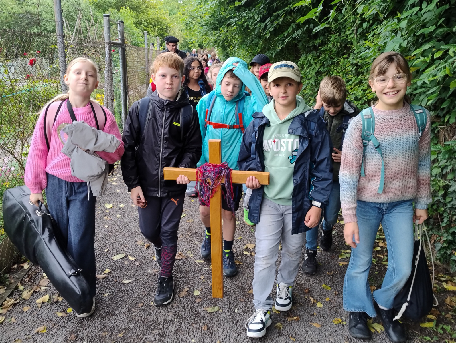 Am 06.06.25 fand unser erstes Projekt in Kooperation mit der Pfarrei St. Joseph statt: ein gemeinsamer Pilgertag. Nach einem Gottesdienst in der katholischen Kirche um 8.15 Uhr mit dem Impuls „Sorgt euch nicht!“ starteten wir unsere Tour mit etwas zeitlicher Verzögerung aufgrund des unbeständigen Wetters. Doch ab dann hatten wir Glück: Das Wetter hielt, immer wieder ließ sich auch die Sonne durch die Wolken blicken. Unterwegs hielt die Gruppe an verschiedenen Stationen, die vom Vorbereitungsteam sorgfältig ausgewählt und auf das Thema „Gottes wunderbare, bunte Schöpfung“ abgestimmt waren. Die Kinder bekamen ein Pilgerbüchlein mit Aufgaben, die sie erfüllen sollten. Es wurden gemeinsam Lieder mit Gitarrenbegleitung gesungen und Dankes-Sätze notiert. Ein besonderer Moment war das Nutria, das sich für eventuelle Essensreste in unseren Rucksäcken interessierte und sehr neugierig und dazu wenig menschenscheu war.