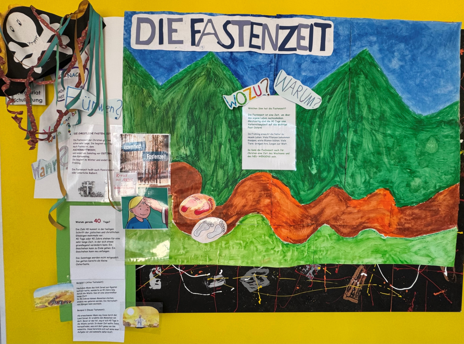 Durch Impulse von seiten der Schulpastoral sind Kinder und Erwachsene eingeladen, ihre Gedanken, Fragen und Vorhaben in dieser besonderen Zeit miteinander zu teilen – im Gespräch am Plakat, durch aufgeklebte Ideen und anderes….