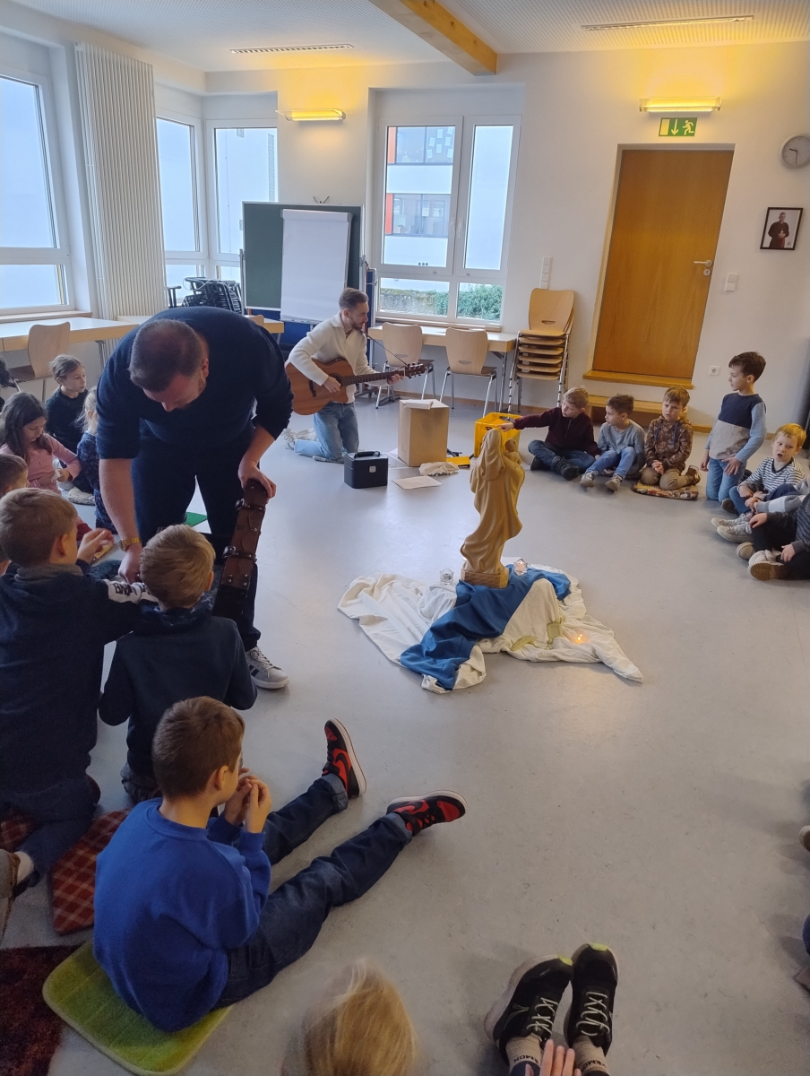 Die Kinder hörten interessiert zu, stellten Fragen und sangen bei Gitarren- und Cajonbegleitung kräftig mit.